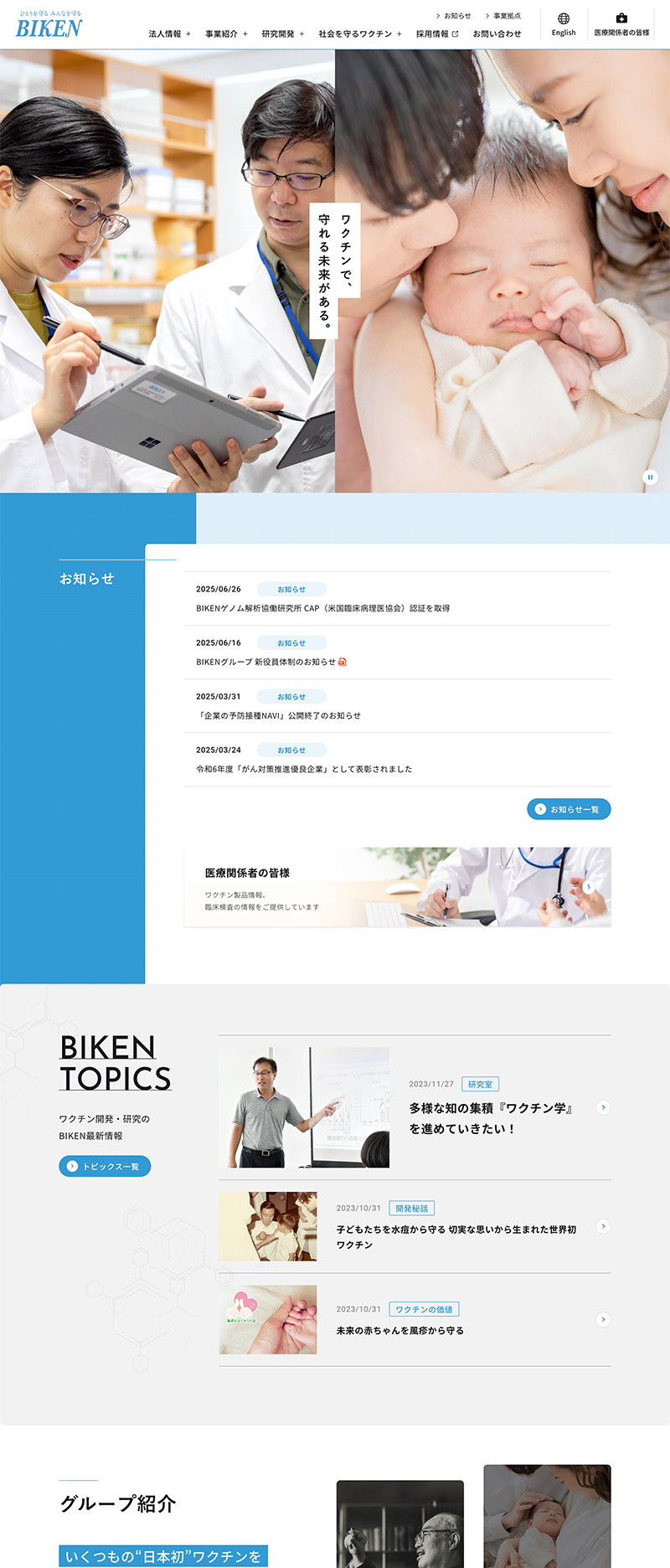 「ワクチンの価値」ページでは、BIKEN様が開発したワクチンの重要性を広く伝えるコンテンツを設置。特に、一般生活で見過ごされがちなワクチンの存在に焦点を当て、訪問者にその価値を理解してもらえるよう工夫しました。具体例として、「母子手帳に記載されるBIKENワクチン」の重要性を紹介し、グループとしての社会貢献を強調しています。
