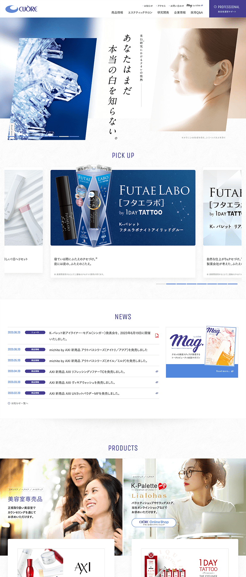 カウンセリング化粧品のパイオニア企業であるクオレ様のコーポレートサイト、採用サイト、ブランドサイト、人気商品のプロモーションLP、研究開発を行う製薬会社様のコーポレートサイト、そして有益な美容情報を発信するオウンドメディア「Mag. By CUORE」まで、ノイで一貫して制作させていただきました。