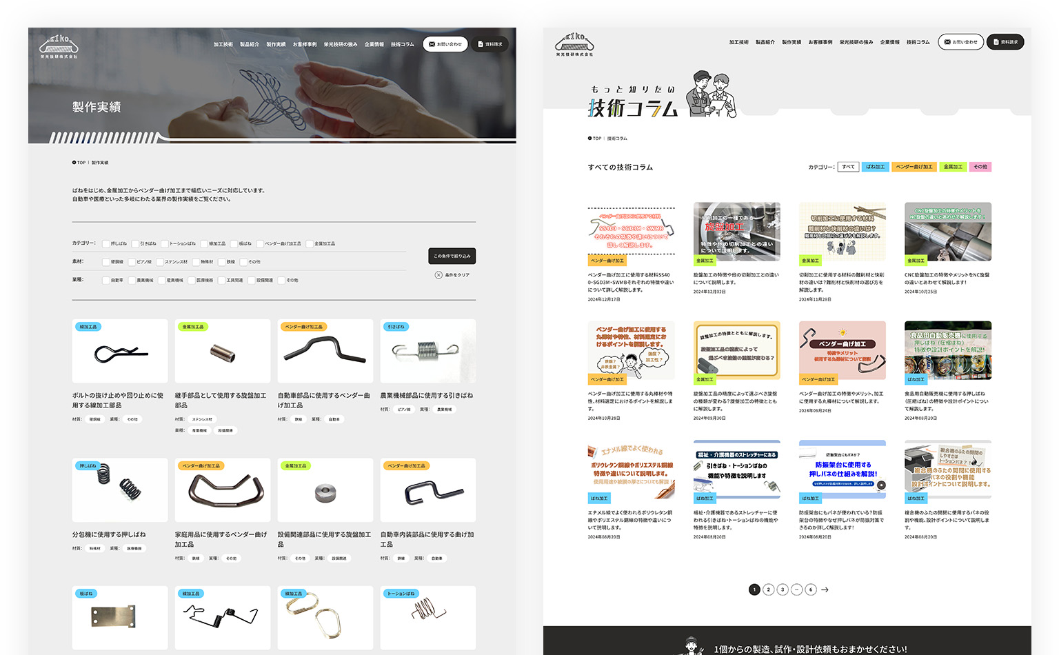 技術者だけでなく、若手担当者の方からのお問い合わせも多く寄せられている栄光技研様。加工技術ごとにカラーを設定し、各製品がどの加工技術を用いて製造されているかをひと目でわかるよう工夫しました。また、サイト訪問者の関心に応じて、「技術コラム」や「制作実績」などの関連コンテンツへスムーズに誘導できるよう設計しています。