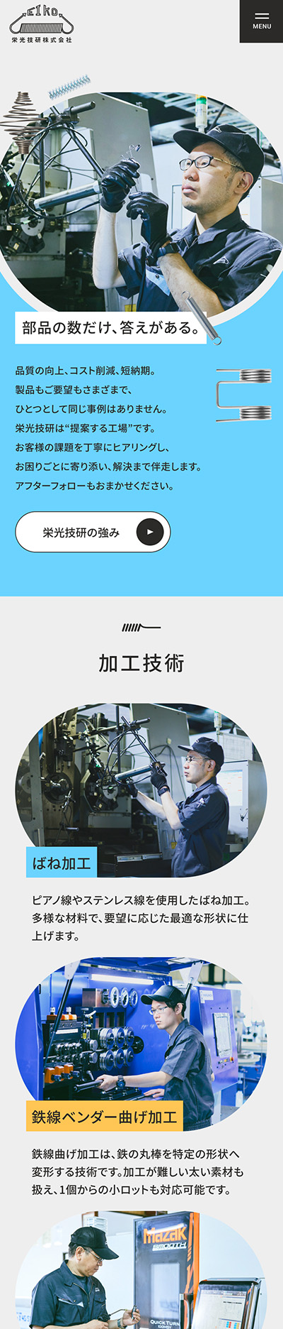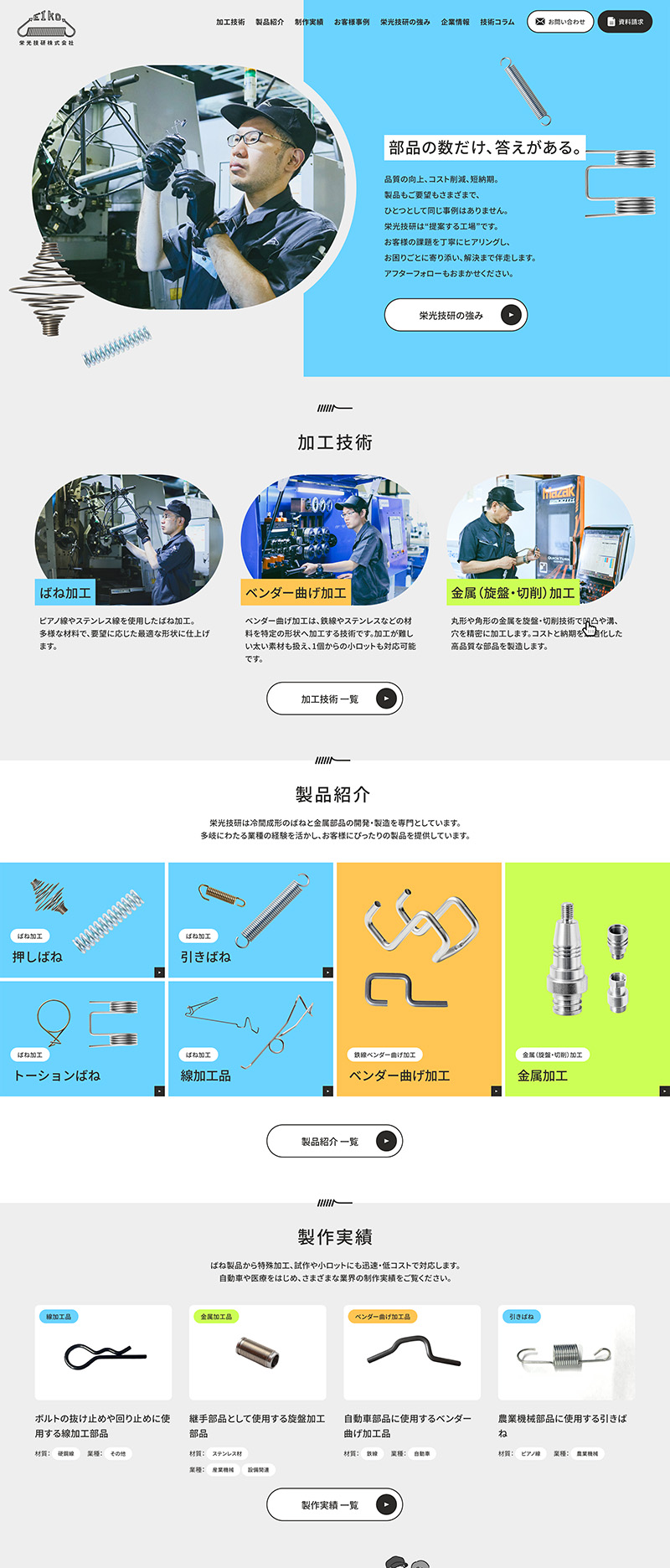 ものづくりのまち・東大阪で、ばねや金属部品の開発・製造を行う栄光技研様。約50年もの間、最新技術や難加工に挑戦し続け、多岐にわたる分野で数多くの実績を築かれている部品メーカーです。これまでのWebサイトも高く評価されていましたが、時流に合わせてリニューアルされることに。お付き合いのあるクライアントからのご推薦を受け、ノイでプロジェクトを担当させていただきました。