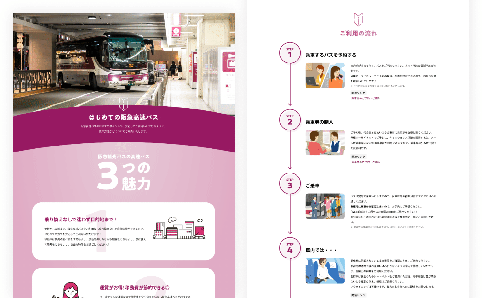 阪急高速バスのメリットや乗車の流れを紹介する安心感醸成コンテンツ。「はじめての空港バス」「はじめての貸切バス」も制作しました。