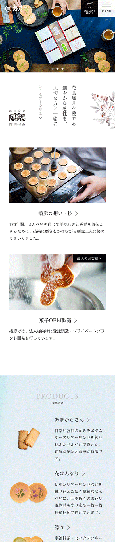 公式サイトではブランディングに注力しました。播彦ブランドの強みや手仕事のこだわりを伝えられるよう、工場での撮影に加えてスタイリング撮影も実施。社内コピーライターが何度もヒアリングを重ねてコンセプトを作成しました。繊細な技術や素材へのこだわり、菓子への深い愛情を言語化し、おいしさの背景にあるメッセージを伝え、ブランドイメージの向上に努めました。公式サイトで共感・興味を高めた流れで、自然にオンラインショップの商品ページに移動できる設計とし、離脱を防ぐ工夫をしています。