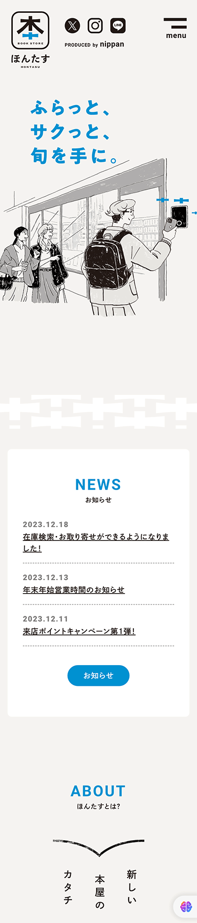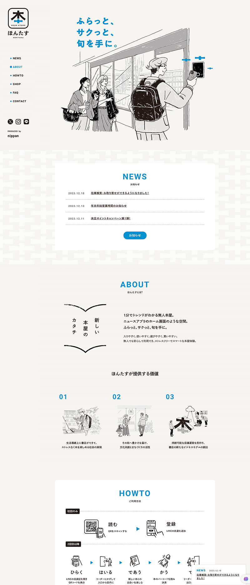 「ほんたす」第一号店のオープンに伴い、その目的や社会的意義、将来のビジョンを伝えるとともに、入店から決済、会員証発行という一連の体験をイメージできるWebサイトをご所望でした。