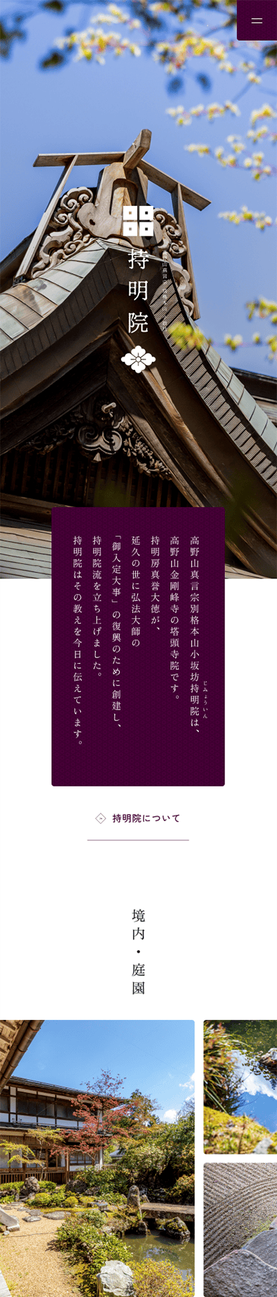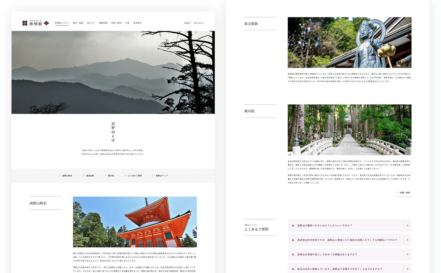 制作初期にスタッフとカメラマンが高野山を訪れて境内を撮影しました。お寺の雰囲気を肌で感じ、住職様からお話をお聞きする中で、シンプルかつ穏やかで品のあるデザイントーンで「持明院様らしさ」を表現できるのではないかと考え、いわゆる観光名所としての寺院サイトの対極を意識したサイトづくりを意識しました。