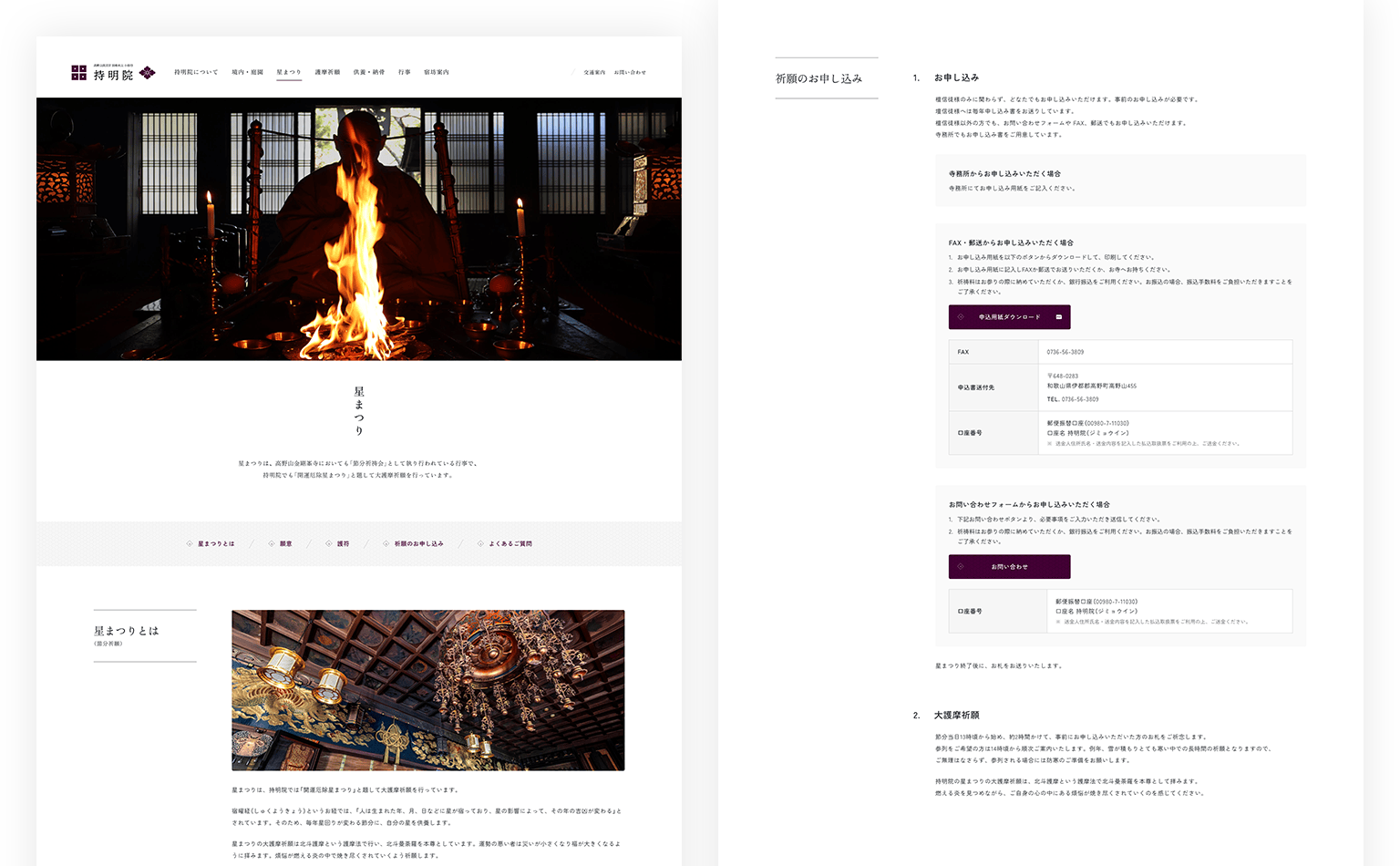 高野山の寺院で重要な年中行事について個別ページを設置。申し込み方法や郵送対応、持ち物、よくある質問などを掲載し、檀信徒ではない新規層への訴求や電話による問い合わせの手間を省く効果を狙いました。