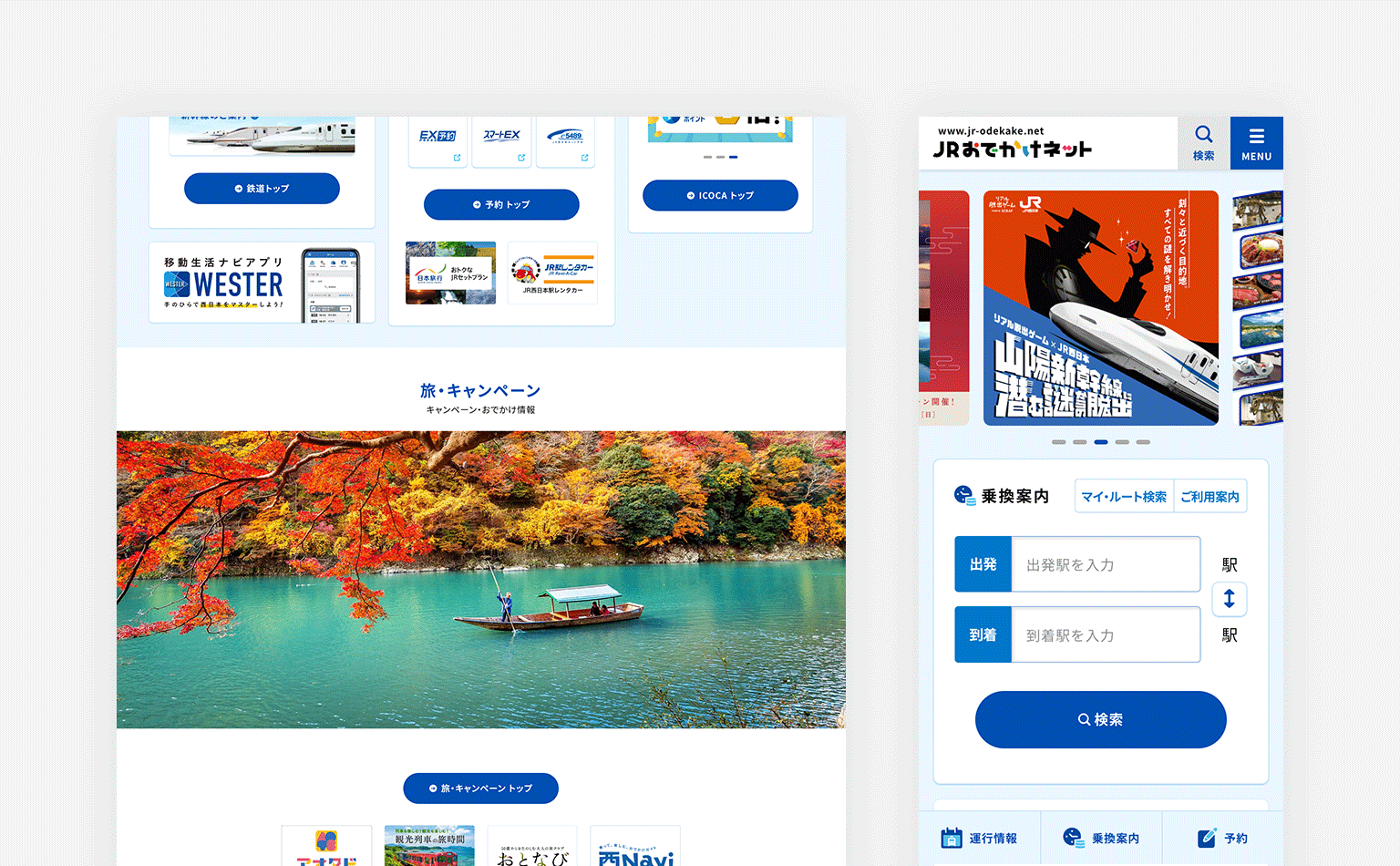 ユーザーが必要な情報にスピーディーにアクセスできるよう主要コンテンツへの導線を集約。スマホ画面にはよりニーズの高い「運行情報」「乗換案内」「予約」の固定メニューを設置しました。シンプルなデザインだけに単調にならないよう、旅情を誘う景観画像を大きく配置するなど、メリハリのある展開を心がけました。