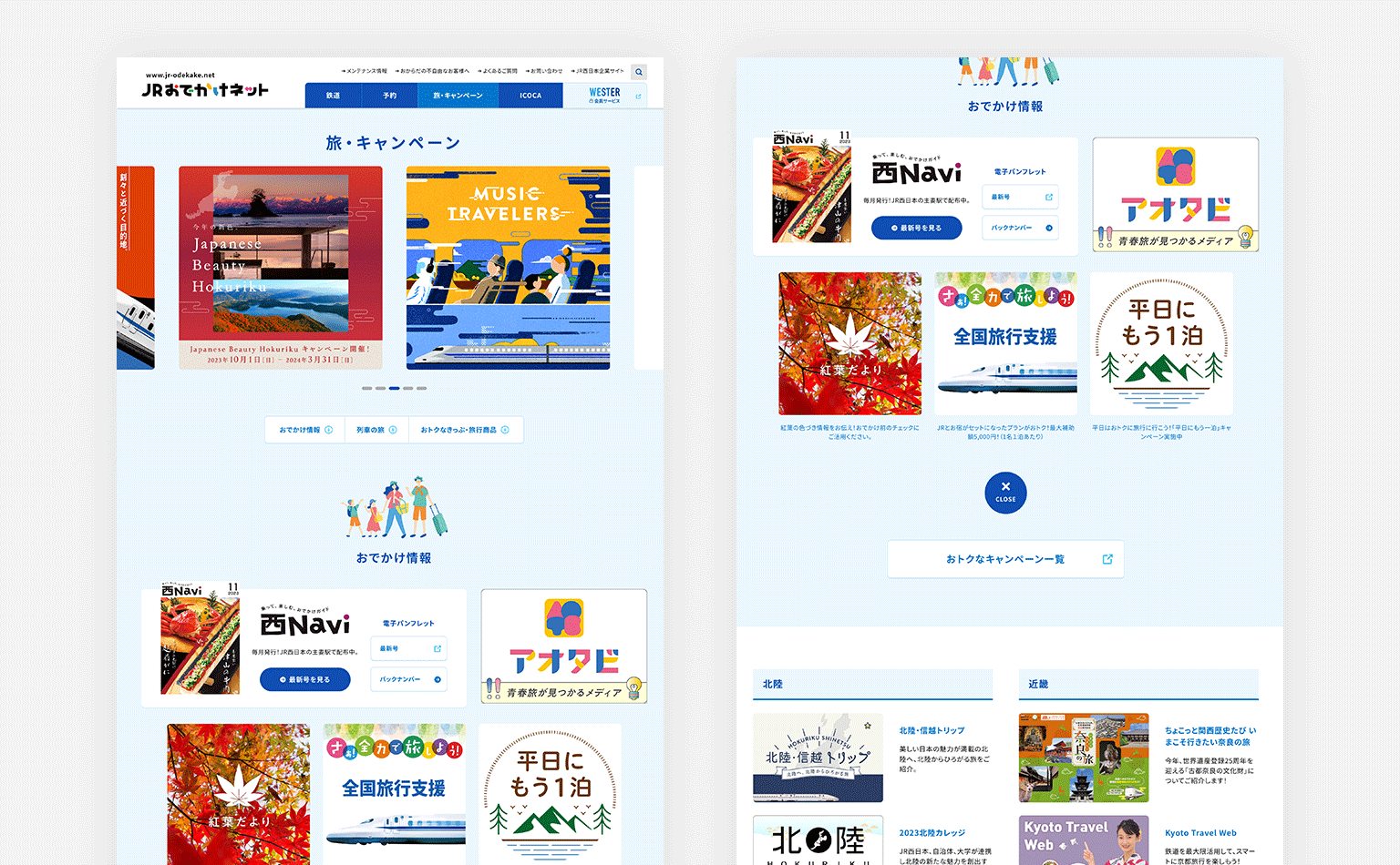 「旅・キャンペーン」カテゴリーを新しく設け、分散されていた旅関連コンテンツを1カ所にまとめました。おでかけ情報やキャンペーン、旅商品のバナーを広く見渡せるよう配置し、種類の多さと楽しい雰囲気を強調。旬の企画を打ち出すとともにエリアや特徴の項目を設け、ユーザーの目的や興味を捉えることを目指しました。