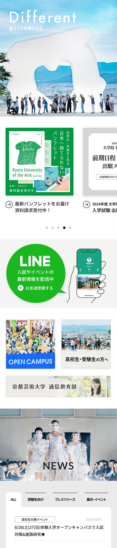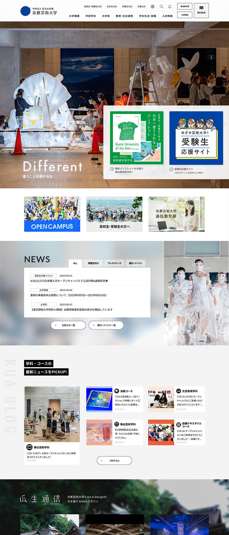 京都芸術大学様は、18歳から90歳代まで、日本や世界から多くの学生が集まる日本最大の芸術大学です。芸術教育の最前線ともいえる豊かな学びを特色としており、入試広報においても常に先進的なアプローチを実践されています。ノイでは、2013年にサイトリニューアルをご依頼いただいて以来、サイト保守やLP作成などさまざまなプロジェクトをご支援してきました。時代の動向を敏感にとらえて一歩先のクリエイティブで発信を行い続ける京都芸術大学様の精力的なスタンスに、いつも刺激を受けています。