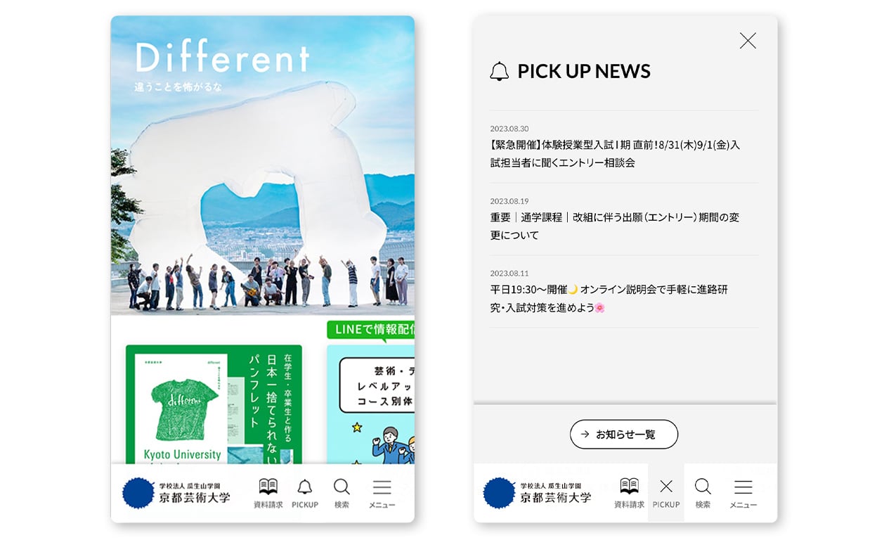 年に何度も開催されるオープンキャンパス情報や入試の最新情報など、重要な情報の更新頻度が高くて量も非常に多いため、メインビジュアル内に情報発信エリアを配置。バナーを正方形に統一し、SNSへの転用も考慮した利便性の高いデザインにしています。 また、新着情報に気づきやすいように、デザインの初期段階で「ベル通知」をノイから提案。高校生にとっても馴染みのあるUIを採用し、情報の取りこぼしがないように配慮しました。
