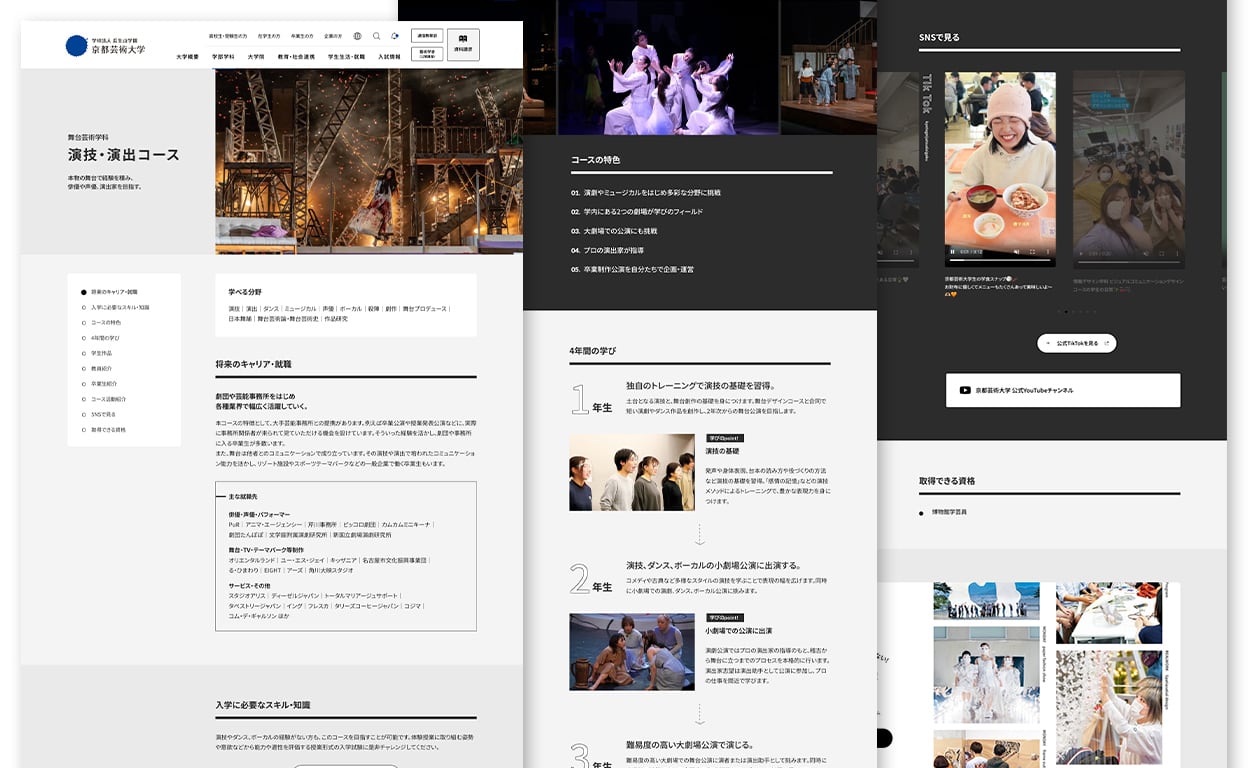 「将来のキャリア・就職」をページ上部に配置し、芸術大学へ進学する場合に持たれがちな卒業後の不安を解消。その下に続く「入学に必要なスキル・知識」では、芸術に興味はあるけれど自信がない層向けに、知識や技術よりも意欲を評価する「体験授業型入試」へ誘導し、幅広い受験生への訴求を強化しました。 デザインやアニメーションでは、興味喚起の仕掛けやメリハリのある見せ方を意識。ページの読み込み時間短縮を追求しました。TikTokをはじめとしたSNSとの連携を強化し、学びの臨場感を描出しています。
