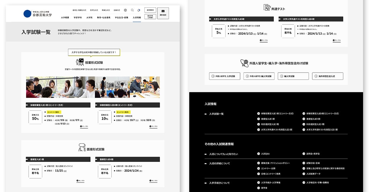 京都芸術大学様は数多くの学科・コースを有し、入学を目指している層も日本の高校生を中心に、外国人留学生、社会人、編入学生など非常に多彩です。セグメントごとに受験に必要な情報が異なるため、入試関連ページは何度もヒアリングの場を設けて意見交換を行いました。