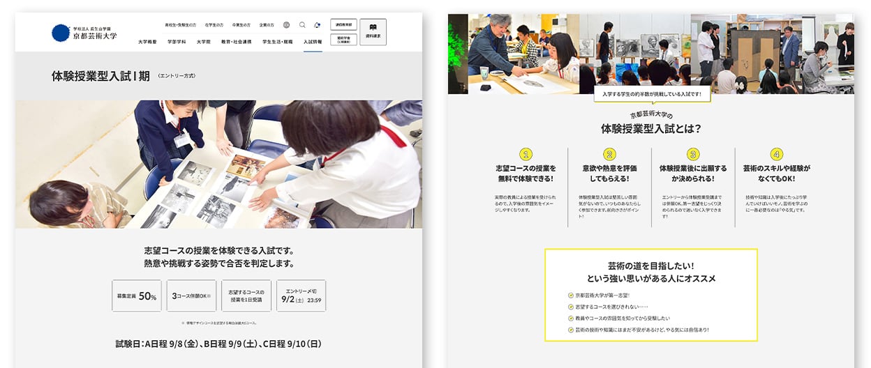 京都芸術大学様ならではの評価方法を取り入れた「体験授業型入試」ページでは、受験の流れや詳細情報に入る前に、入学者の約半数が受験している試験であることや芸術の知識や技術がなくてもチャレンジできることをしっかり伝えて、幅広い層の受験意欲をかき立てるように工夫しました。