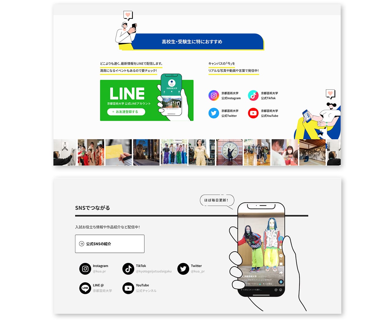 大学様が精力的に発信している各種SNSをサイト内に盛り込み、学生たちのリアルを直感できる構成に。TikTokはランダム表示とし、多彩な動画に出会えるように工夫しました。