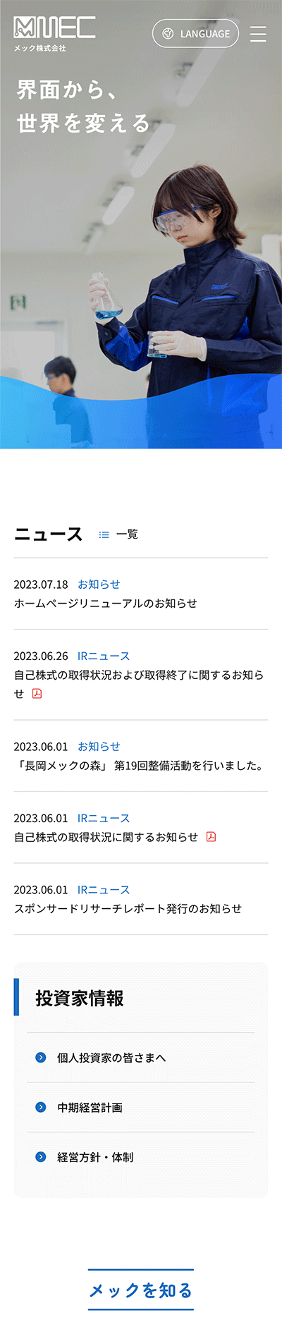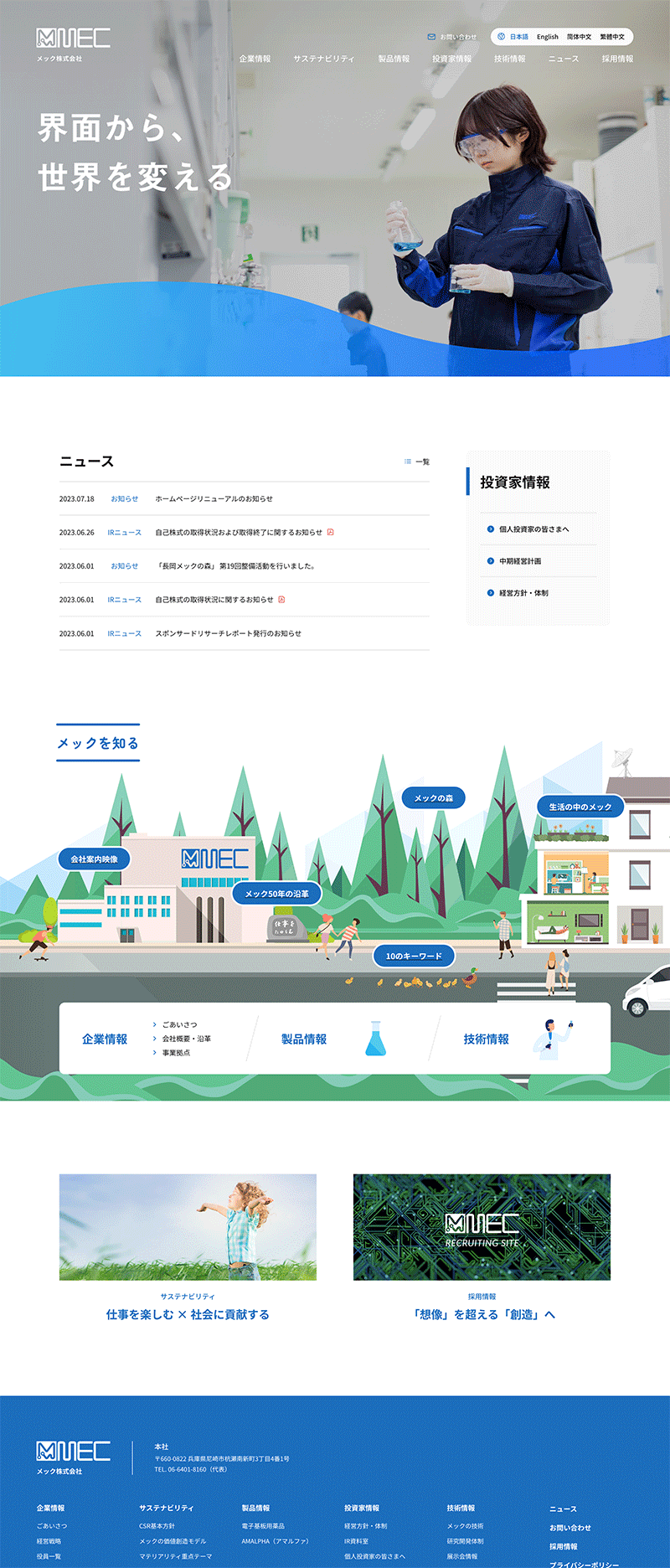 コーポレートサイトの顔となるメインビジュアルについてはアイデアが必要でした。化学薬品そのものをビジュアルにしても弱く、研究開発風景もさまざまな企業であまりに使われすぎています。そこで、製品の研究開発・製造風景の人物写真に、最終的な製品であるパソコンやスマートフォン、自動車などの利用シーンをアニメーションで切り替えながらオーバーラップさせる形に。「界面から、世界を変える」のコピーとともに、メック様の製品がさまざまな分野のイノベーションを支えていることを表現しました。