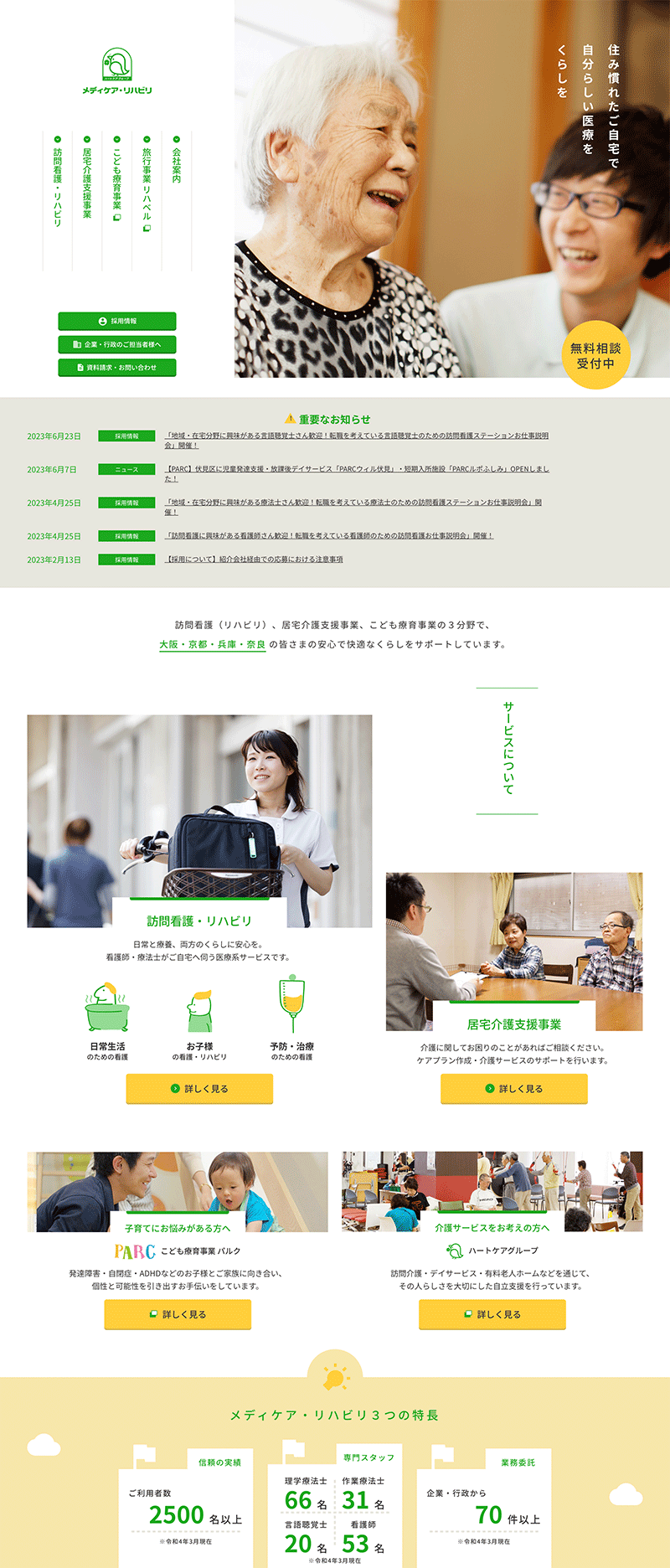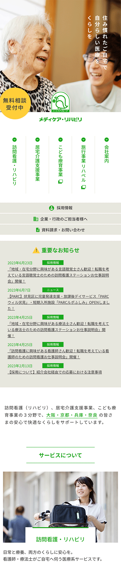 関西4府県で訪問看護サービスや居宅介護支援事業などを展開している、メディケア・リハビリ様のコーポレートサイトです。新しい事業を立ち上げるタイミングでサイトリニューアルをご依頼いただきました。在宅医療が必要な方やそのご家族、また、転職を考えている医療職の方が安心して問い合わせたくなるサイトを目指しました。