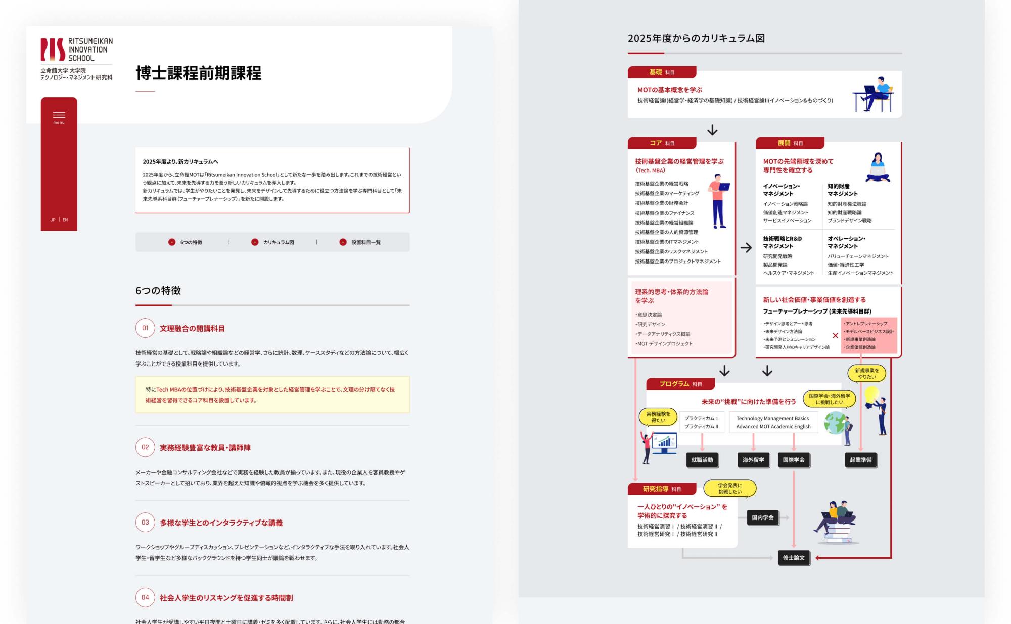 立命館大学 大学院 テクノロジー・マネジメント研究科(MOT)様は、技術と経営を結びつけてイノベーションを生み出す「技術経営」の学びを提供している大学院です。2023年にノイが担当した「立命館大学ビジネススクール(立命館大学 大学院 経営管理研究科)」のWebサイト制作の実績を評価していただき、同じ担当者様からのご依頼で、MOTのサイトリニューアルも手掛けることになりました。