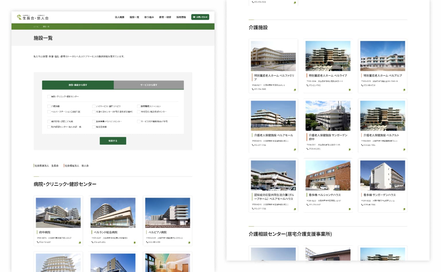 生長会・悠人会様の事業所数は数多くあるため、詳細情報を更新しやすいようにCMSを採用しました。一覧ページではユーザーが目的の施設のページにスピーディーにたどり着けるよう、「施設・機能」および「サービス」から探せる絞り込み機能を実装。サイトを訪問される方のニーズを捉え、複数項目を選択できるように設計しました。