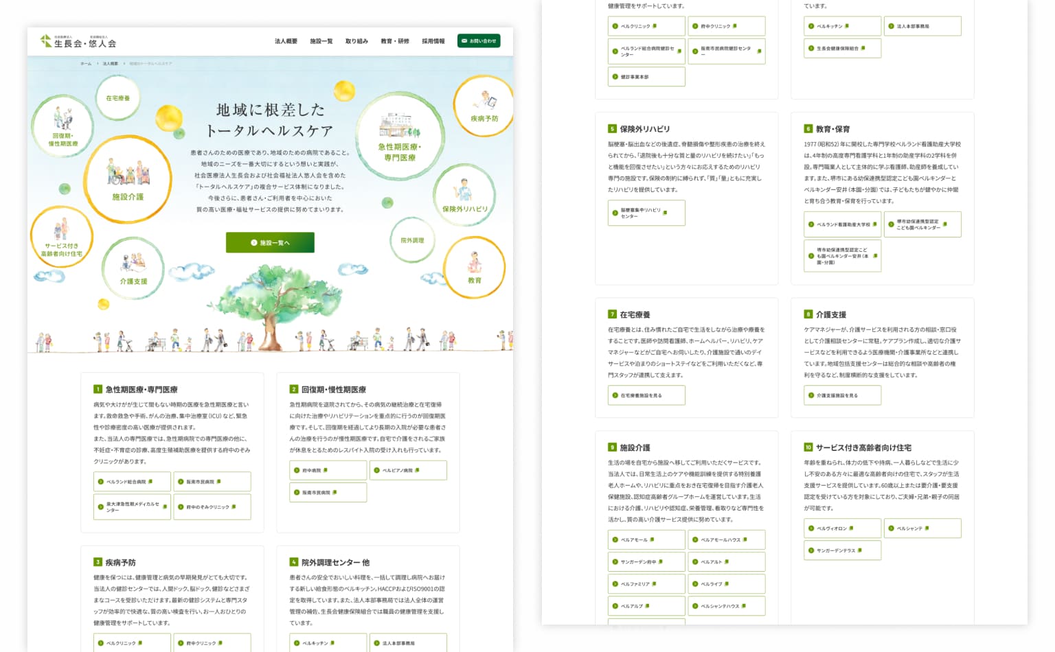生長会・悠人会様が最も大切にされている、患者さんと地域に対する思いを紹介するページを新設。地域に根付いていることを表現する大きな木と、地域に暮らす人々に寄り添うイメージを水彩タッチのイラストで印象的に表現。提供サービスの概要を紹介するとともに、主な施設への導線を設け、回遊性を高めました。