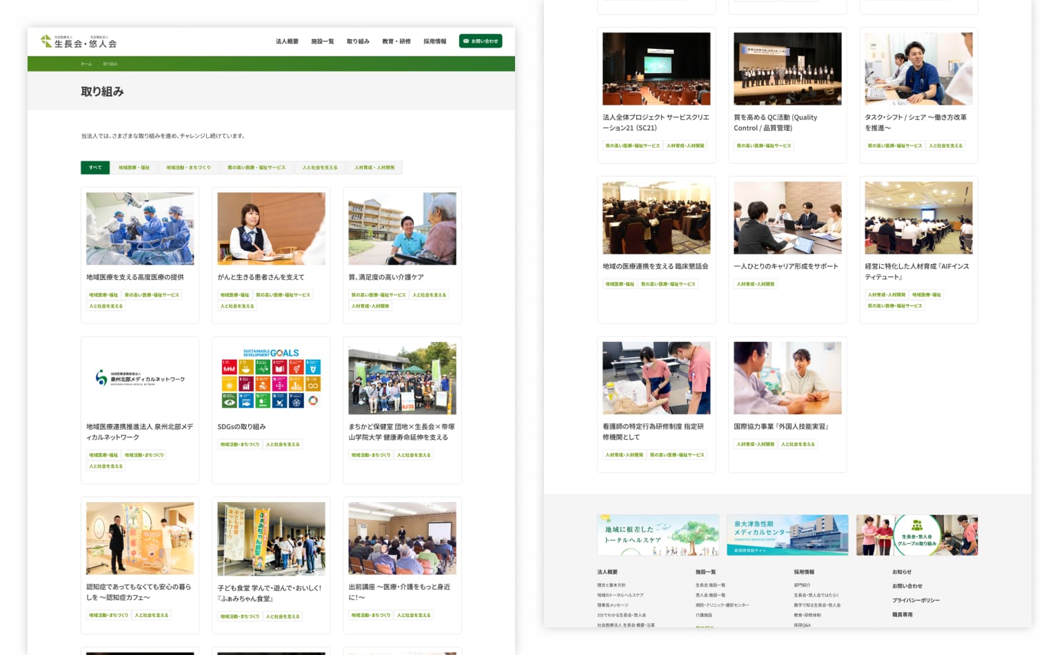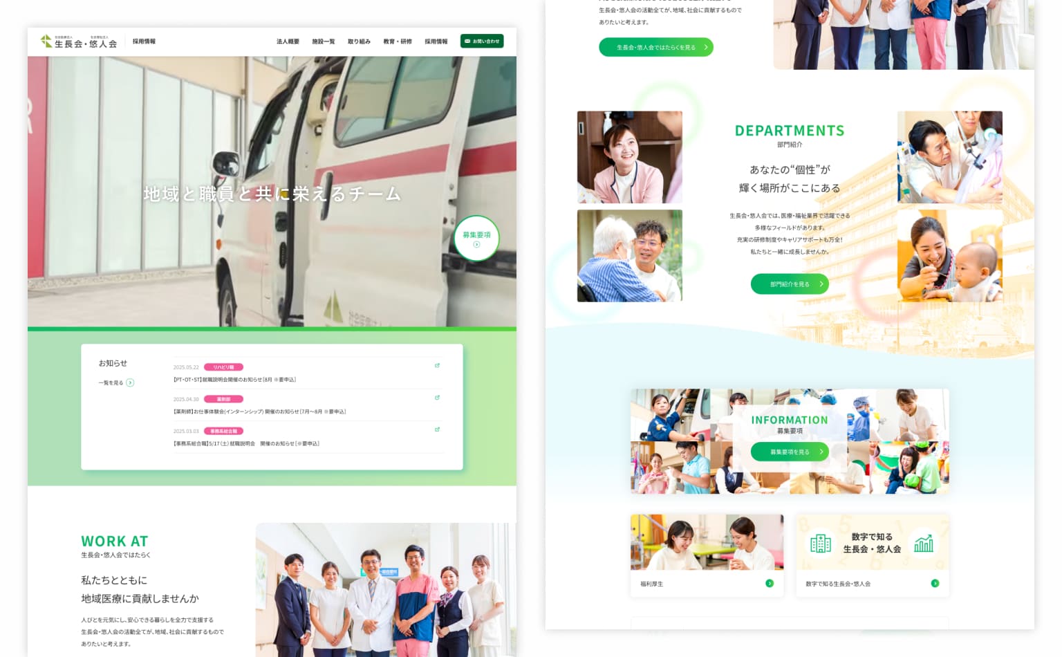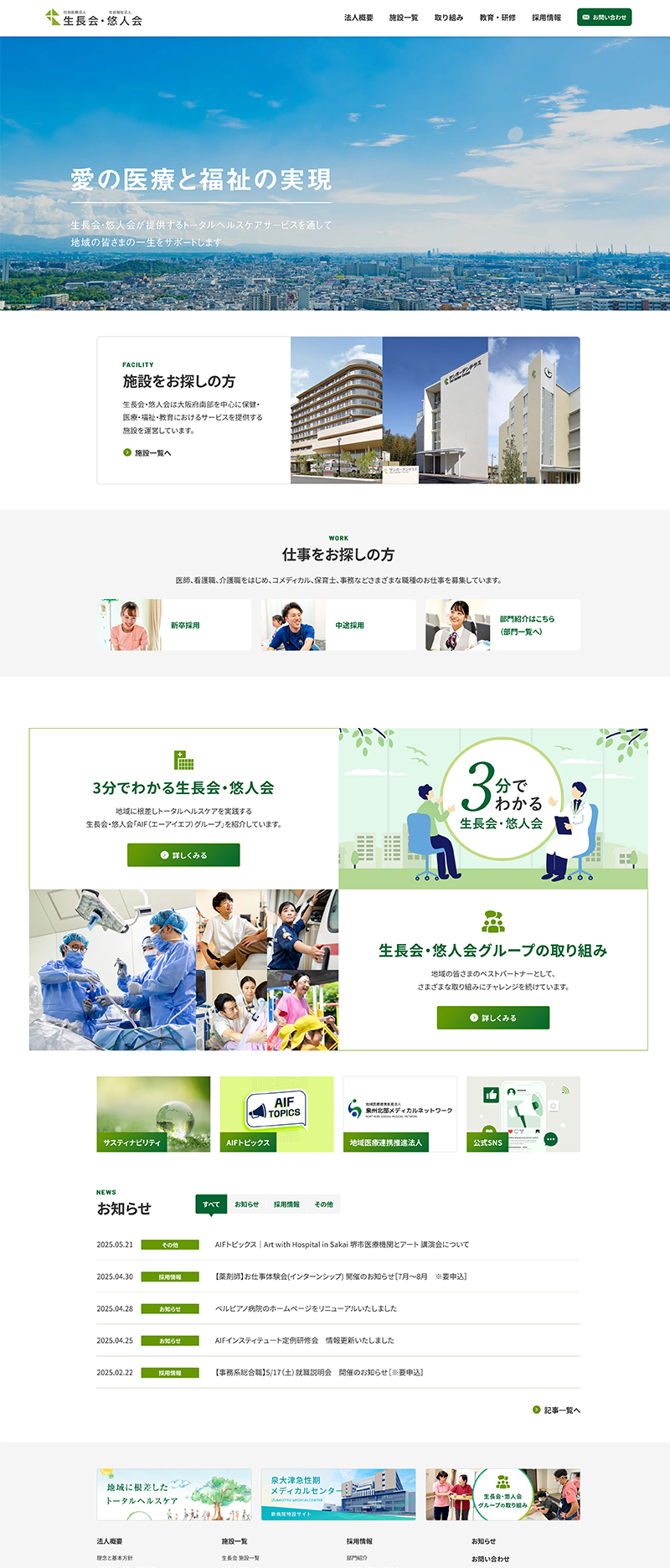 医療法人 生長会様および社会福祉法人 悠人会様は、南大阪地域で医療・福祉の「トータルヘルスケア」の複合サービスを提供されています。今回のサイトリニューアルでは、グループ全体としての総合サイトと、各事業所の求人募集を行う採用サイトを統合。事業所数や部門数が多くあるため、要件定義を細やかに行いながらシステムをスクラッチ開発しました。