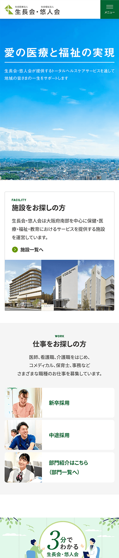 生長会・悠人会グループ全体の規模感やブランド力を訴求するコンテンツを新設し、目につきやすい位置に導線に配置しました。初めてサイトを訪れる方や求職者が生長会・悠人会様についての理解し、共感や信頼を得られるように工夫しています。