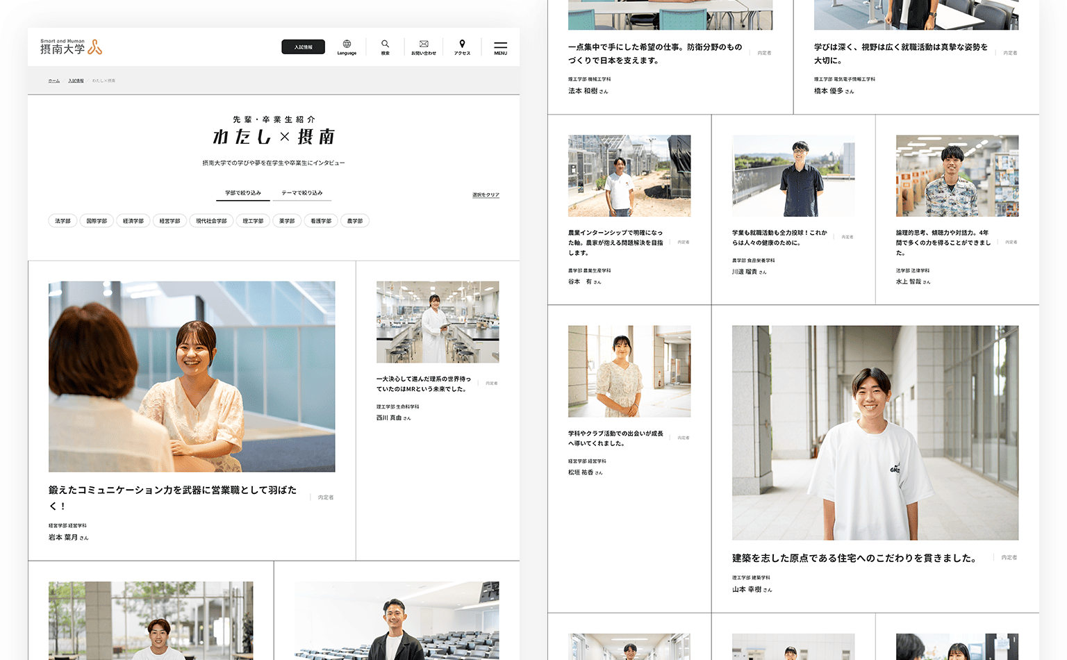 在学生や卒業生が語る大学での学びや成長の実感を通じて、摂南大学での学生生活が具体的にイメージできるように構成。CMS化により継続的な情報発信も可能に。