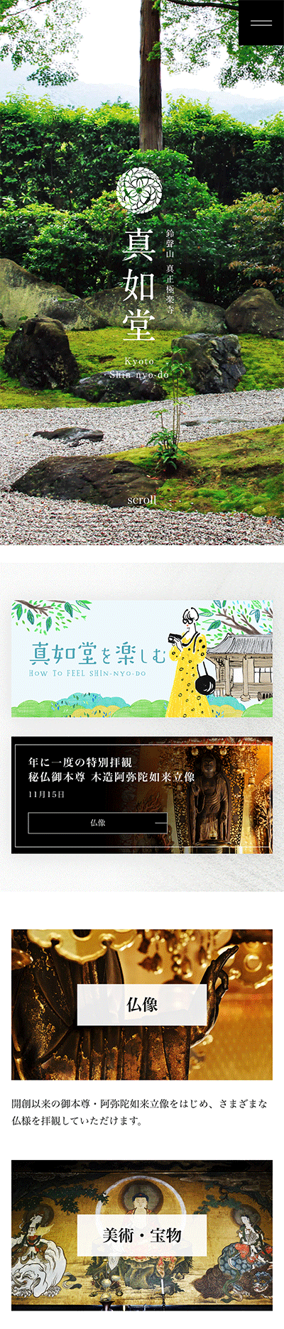 観光客誘致の強化を目指してメインターゲットを「何度も京都に通う若年層の観光客」「通な旅を好むインバウンド観光客」に設定し、「はじめての真如堂/二度目の真如堂」というガイドコンテンツをオリジナルで作成しました。
