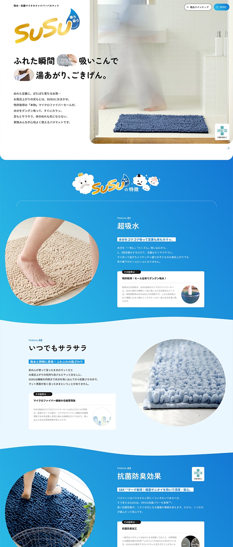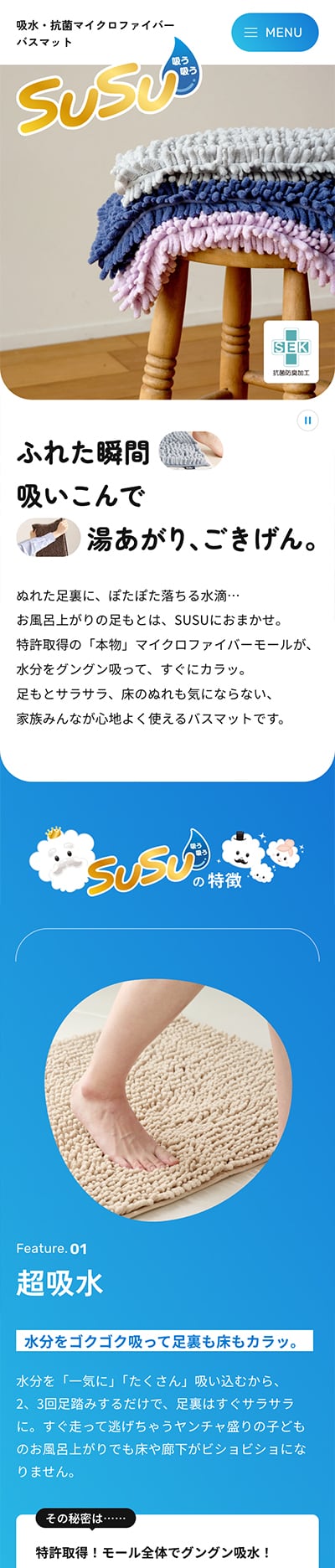 SUSU製品のやわらかさや質感を表現するため、デザインに曲線や丸みを多く用いています。さらに、画像を大きく配置し、要所にアニメーションを加えることで、製品の特長を際立たせています。また、一つひとつのコンテンツにじっくりと目を通してもらえるよう、余白を十分に取ったレイアウトに仕上げました。
