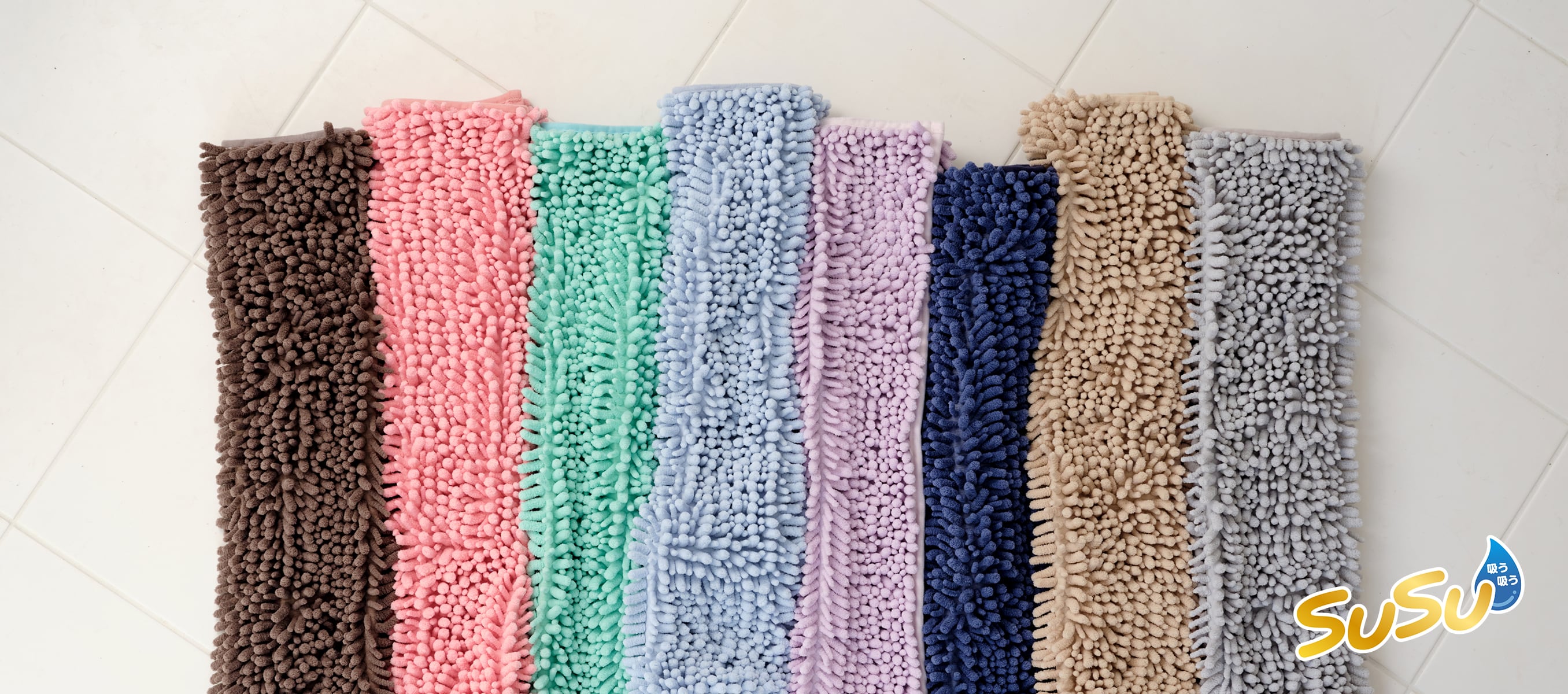 カラーバリエーションやサイズ展開もSUSUの魅力の一つです。メイン画像はカラー選択に連動して切り替わるギミックを取り入れ、見る人がそれぞれのカラーをイメージしやすくしています。また、使用シーンのほか、サイズ違いのマットを重ねたカットや、スワッチを並べたカットを新規撮影し、その豊富さを強調。さらに、動画や使用者の声を紹介し、購入を検討しやすい流れを作り上げました。