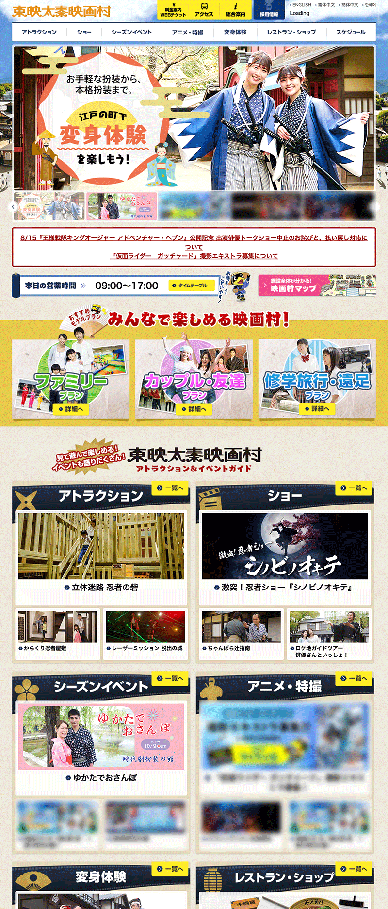 京都は太秦にあるアミューズメントパーク「東映太秦映画村」のサイトです。映画村といえば、映画の撮影にも使われる江戸時代の町並みのセットが有名ですが、実はファミリーやカップルで楽しめるアトラクションもたくさん。大人も子供も、時代劇に興味がある人もない人も幅広く楽しめる、魅力的な施設であることをしっかりと伝えるサイトを目指しました。