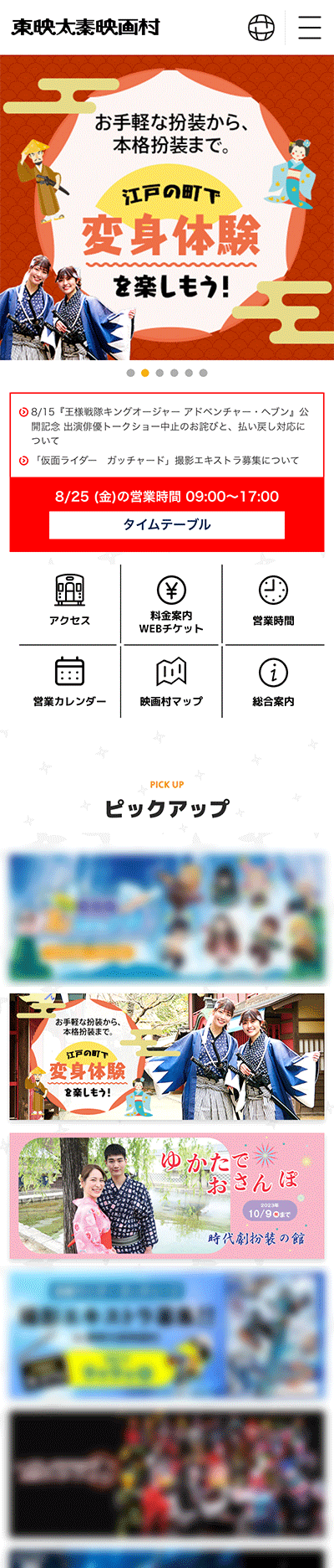 若者・ファミリー層向け施設が充実していることを伝えるため、明るさを感じさせるトーン&マナーを心がけました。配色を従来よりもややビビッドに、各アトラクションやイベントの写真が目立つような配色・レイアウトを採用しています。もちろん、撮影セットも映画村の大きな特長のため、ファーストビューの背景に映画村の全景を配置。フッターには、映画村の入口の写真を背景に、映画村のキャラクターたちが出迎える賑やかなビジュアルに。