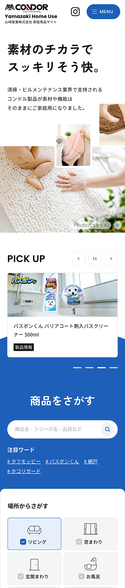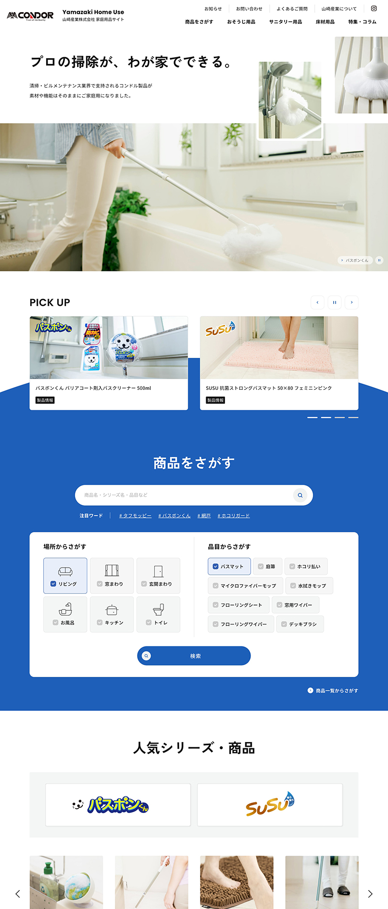 デザインには丸みのあるUIパーツやフォントを取り入れ、親しみやすい雰囲気に仕上げました。全体のトーンは柔らかさを基調にしつつ、コンテンツごとに商品画像やレイアウトに強弱や動きを加え、単調にならないよう工夫しました。また、山崎産業様の製品は主に、清掃・ビルメンテナンス業界で使用されているアイテムを家庭用にアレンジしたものであり、機能性の高さが特徴です。そのため機能性を強調する部分にはシャープなデザインを用いて、プロフェッショナルな印象を与えるよう意識しました。